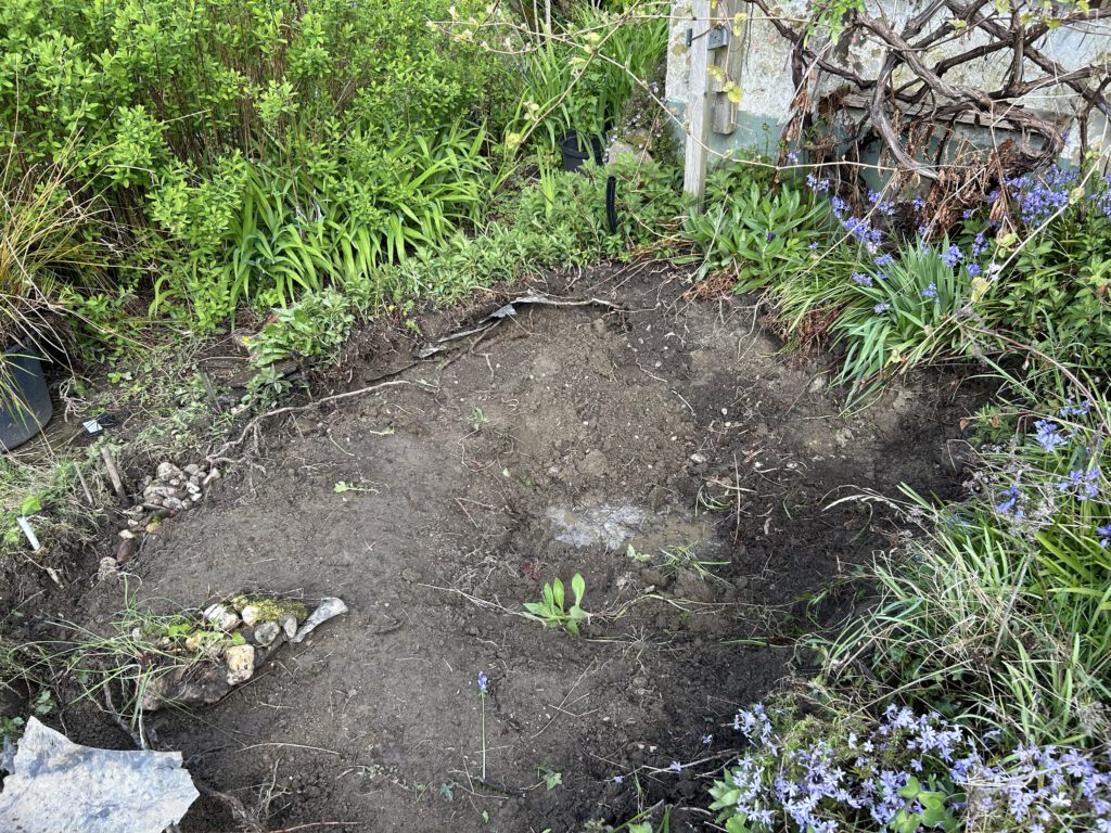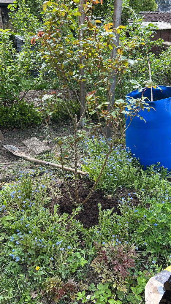 Um das ganze später schön einzufassen, ist außerdem die Rose, die inzwischen eher im als neben der Quitte steht, auch umgezogen worden. Hoffentlich wächst sie gut an.