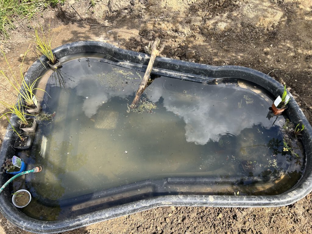 Nachdem der neue Teich schön gerade eingebaut war, haben wir gestern in einer Wasserpflanzengärtnerei etwas Grün für den Teich geholt. Leider etwas zu wenig. Danach ging es mit dem Leeren des alten Teiches weiter, inklusive Umzug der meisten Bewohner. Heute dann entfernen der zwei Schichten Folien, wobei die untere sehr schön am Rand befestigt war…